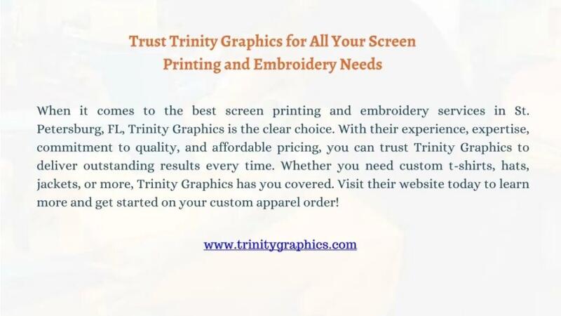 Trinity Graphics is situated at 1005 19th St N, St. Petersburg, FL 33713, making it easily accessible for customers in the local area who wish to visit in person or require local embroidery services.